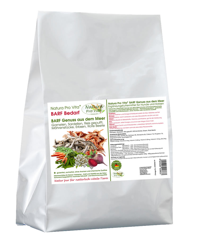 Mit Natura Pro Vita BARF Genuss aus dem Meer bietest du deinem Hund eine natürliche und hochwertige BARF-Ergänzung, die die Kraft des Meeres mit ausgewählten pflanzlichen Zutaten vereint. Sorgfältig zusammengestellt aus Erbsen, Reis, Shrimps, Sardellen, Möhrenstücken und Rote Beete liefert diese Ergänzung wertvolle Nährstoffe für einen gesunden, leistungsfähigen Hund.
